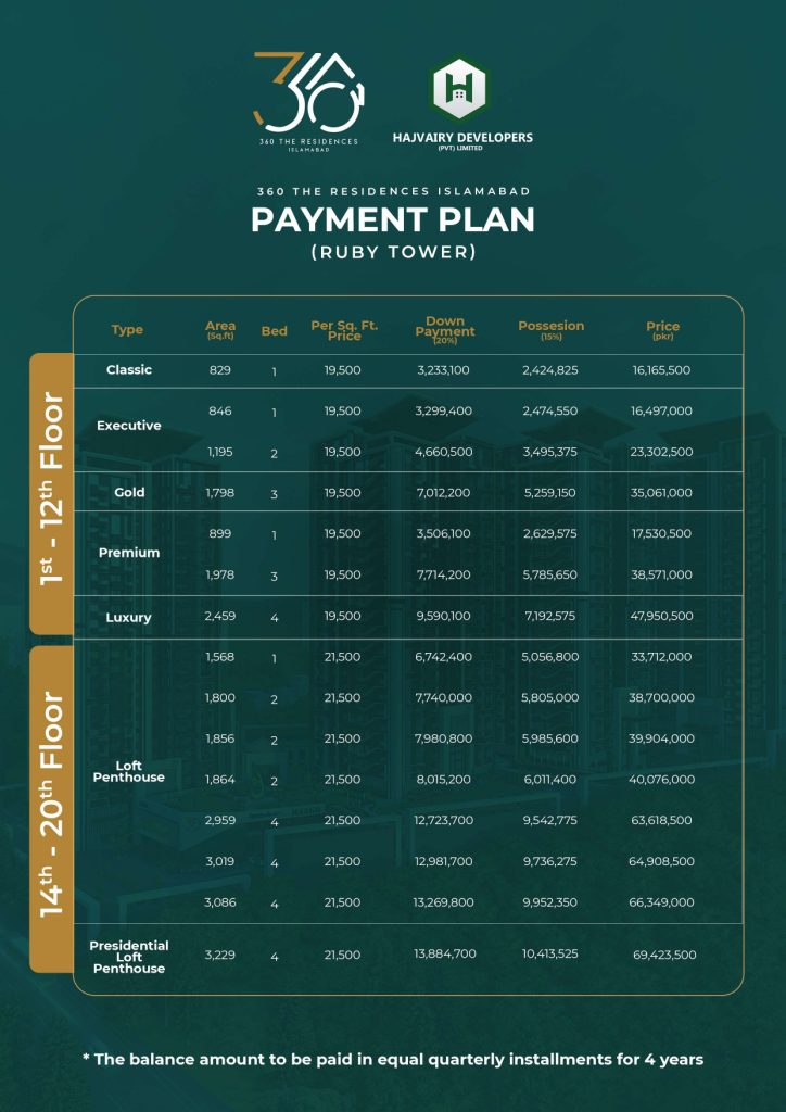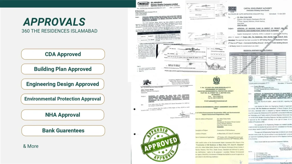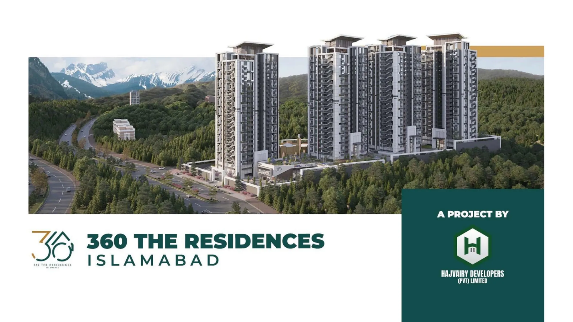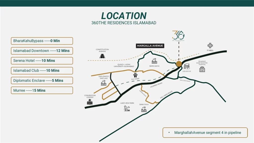 360 The Residences Islamabad is a CDA-approved, high-rise luxury residential project located on Main Murree Road, Bhara Kahu, Islamabad. It’s developed by Hajvairy Developers and designed to blend modern architecture with resort-style living against scenic views of the Margalla and Murree hills.
